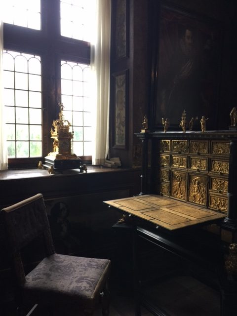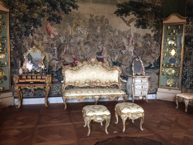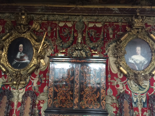 Mike and I had seen a movie or two about Caroline Mathilde of Great Britain, who was a very interesting character, married off to the mad king Christian the VII at age of 15 and then involved in a torrid affair with his chief minister. Rosenborg Castle has a number of their portraits and jewels, along with other collections, although neither of the two would have have lived there. The castle was built as a summer residence in the 1600s and was only used as a royal residence until the 1700s (Caroline Mathilde married Christian VII in 1766). I think both mom and I were hoping the castle would have rooms made up as though the castle was still in use. In fact, it’s more of a museum, with displays of art, jewelry, furniture, china and pewter.