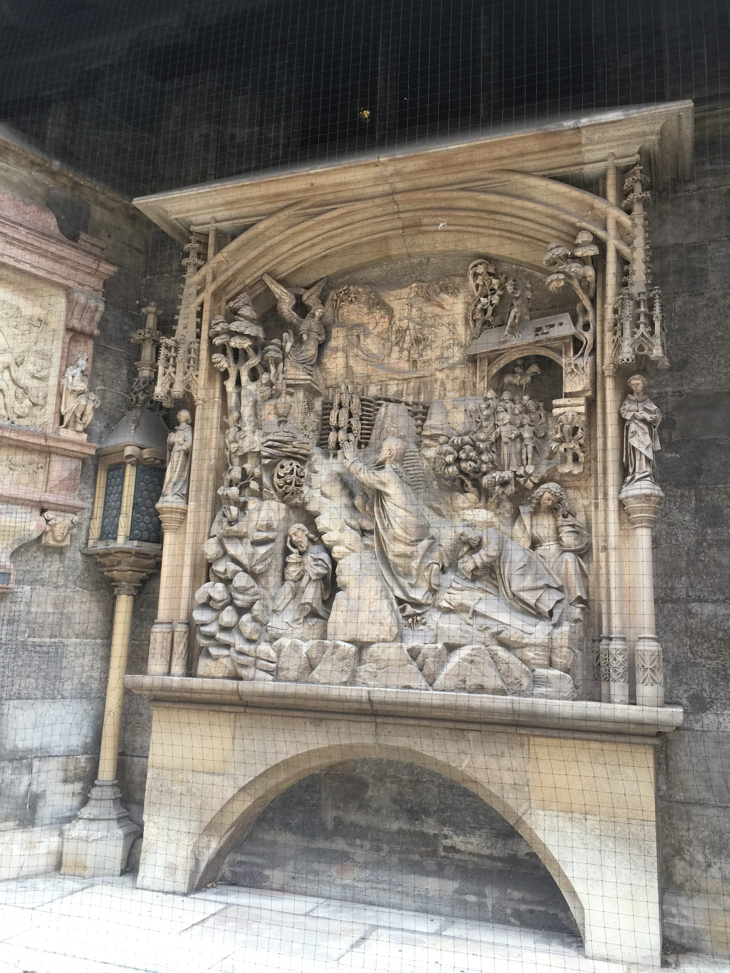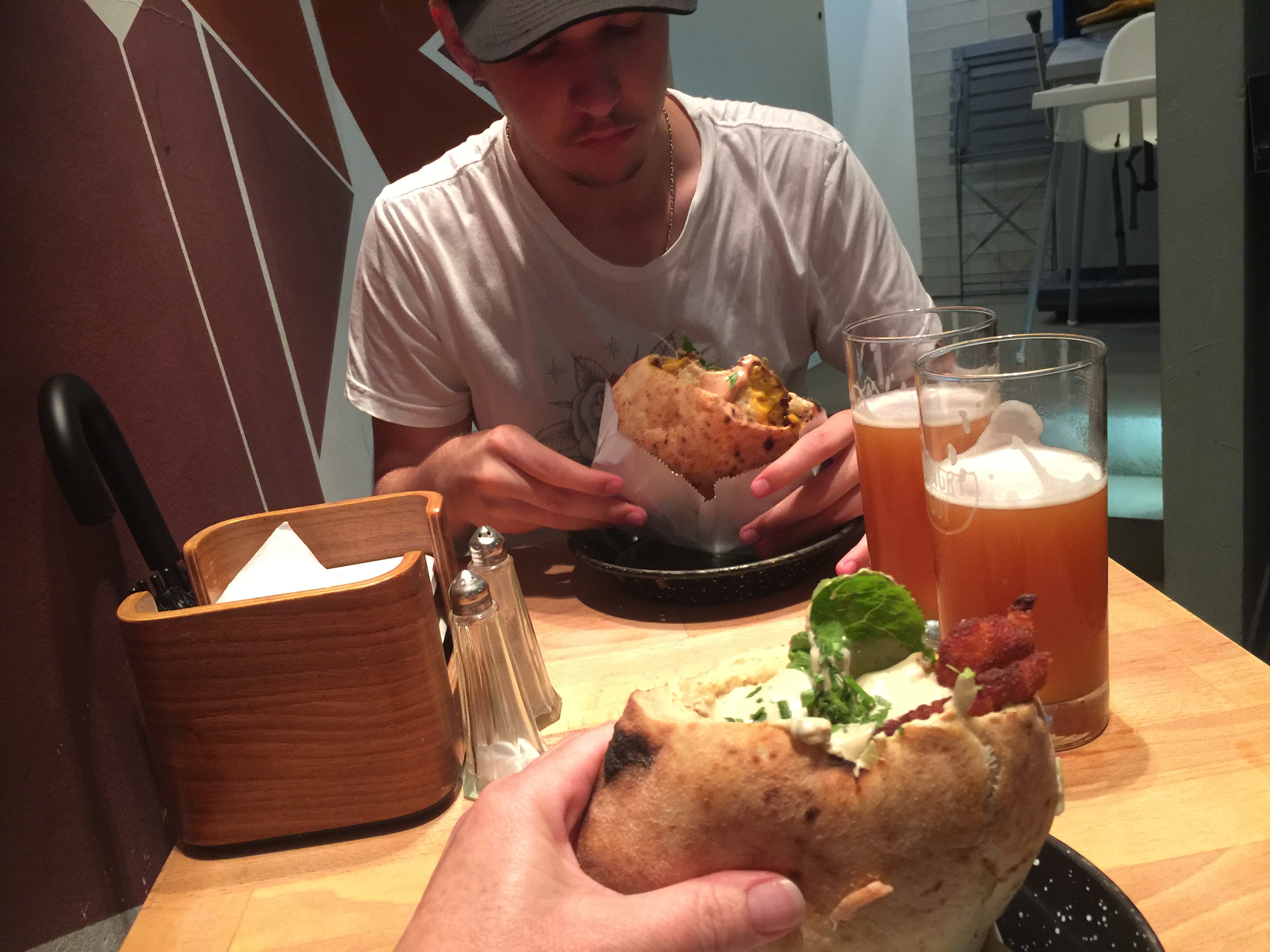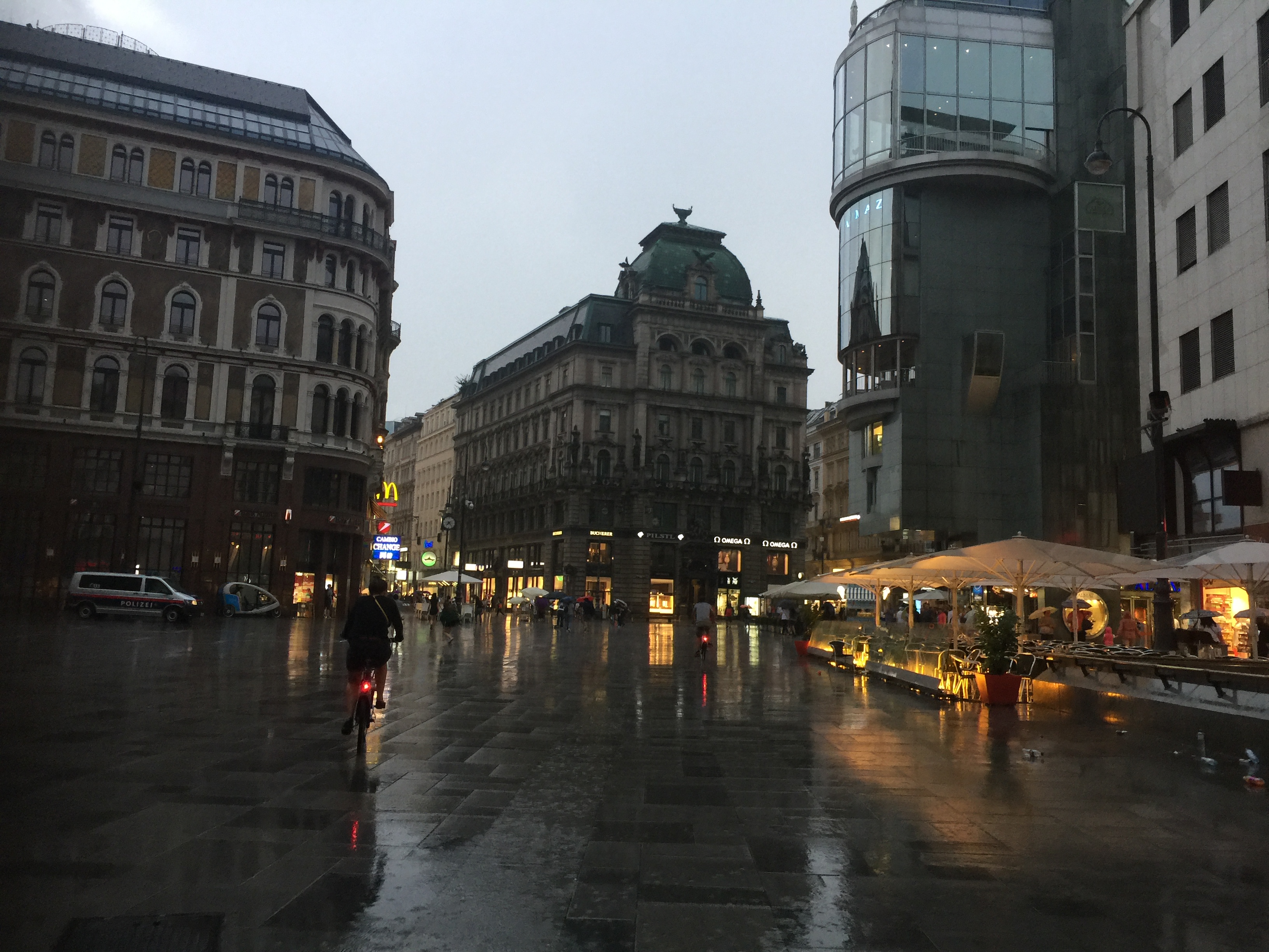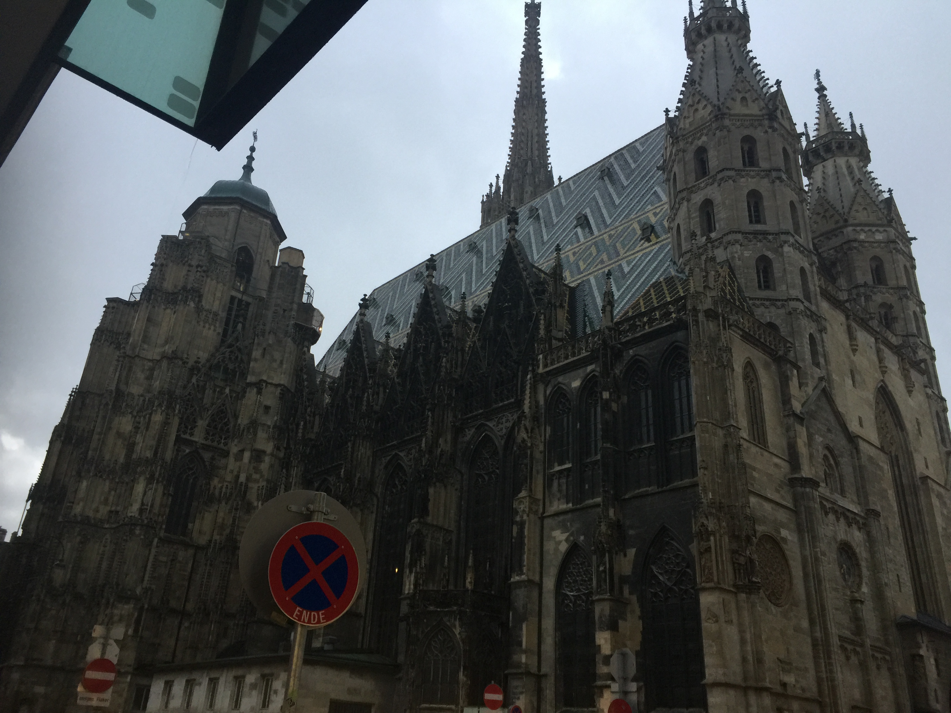 Unfortunately, just after we arrived in Vienna, the clouds opened up and it rained hard for a good hour or so. Jack and I stood in a doorway for a while, weighing our options and watching horse drawn carriages pass with soggy tourists. We decided to brave the storm with our one, broke-ass Idaho umbrella for a short walk to St. Stephen’s Cathedral. Then we ducked into a casual place for dinner – Hungry Guy Street Food – where you can get schnitzel stuffed into a house-made pita. Interesting concept, but too much food for me (maybe the name of the place could have been a clue?).